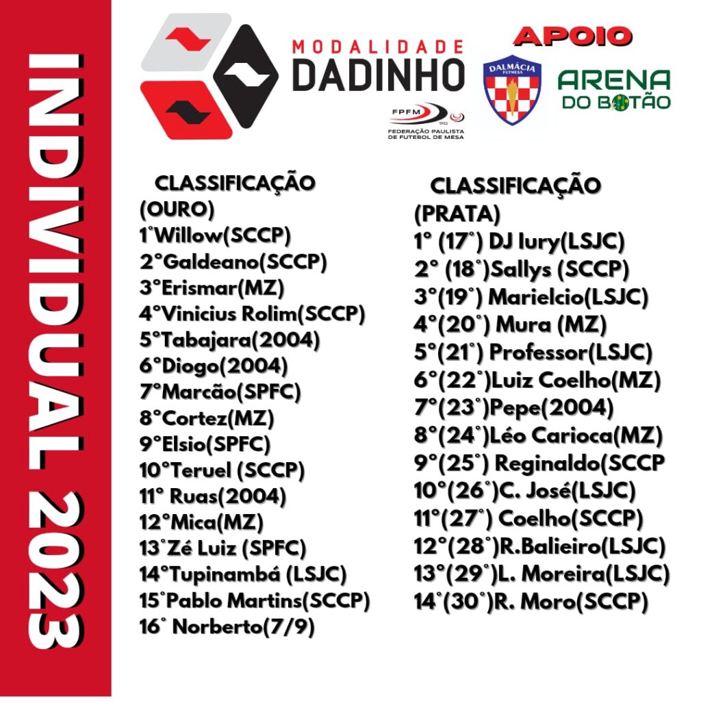 Neste domingo dia 12 de fevereiro estiveram reunidos na sede do Dalmácia Futebol de Mesa, 30 botonistas dos mais diversos filiados da entidade, na parte da manhã tivemos a primeira etapa de equipes, e a classificação final ficou assim:
