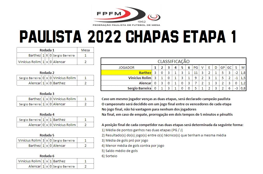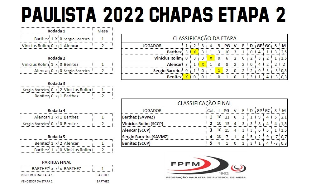 O Campeonato Paulista de Chapas do ano de 2022 terminou na manhã deste sábado (25/6), com Barthez como seu grande campeão. O jogador do Maria Zélia conquistou a segunda etapa do torneio e, como já havia conquistado a primeira etapa, garantiu a posse por mais um ano do troféu de campeão paulista.