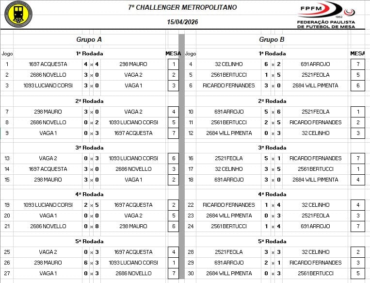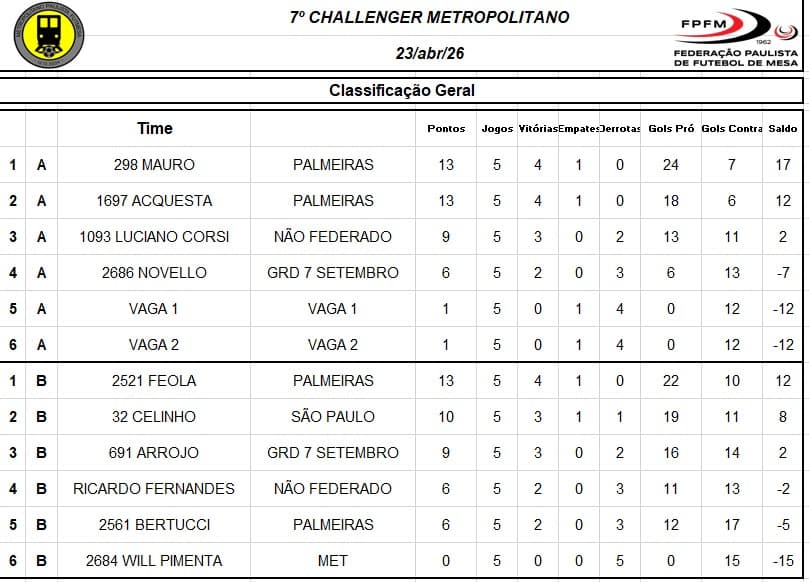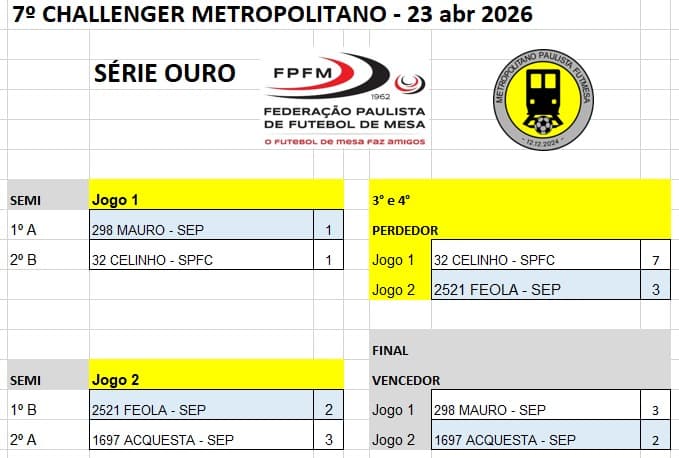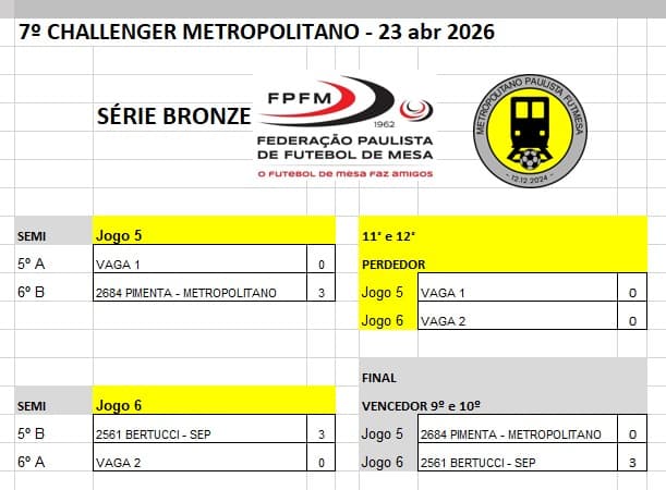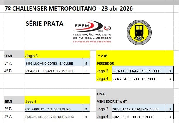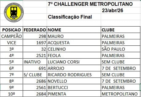 Na data de 23 de abril de 2026 o Metropolitano realizou seu 7º Challenger com 10 participantes . O Palmeiras trouxe 4 participantes tendo o Mauro Campeão seguido pelo Acquesta que mais uma vez fica em Vice no nosso espaço. Em 3º o Celinho levou a medalha de bronze para o São Paulor superando o Feola também do Palmeiras. 7 de Setembro, Metropolitano e Atletas não federados completam a classificação completa da seguinte forma: