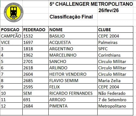 Representantes dos clubes Sociedade Esportiva Palmeiras, São Paulo Futebol Clube, Sport Clube Corinthians Paulista, CEPE 2024, Círculo Militar, Maria Zelia e 7 de Setembro se uniram ao aleta do Metropolitano Futebol de Mesa Willians Pimenta para na sede do mesmo realizarmos nosso 5º Challenger Metropolitano em 26 de fevereiro de 2026.