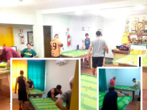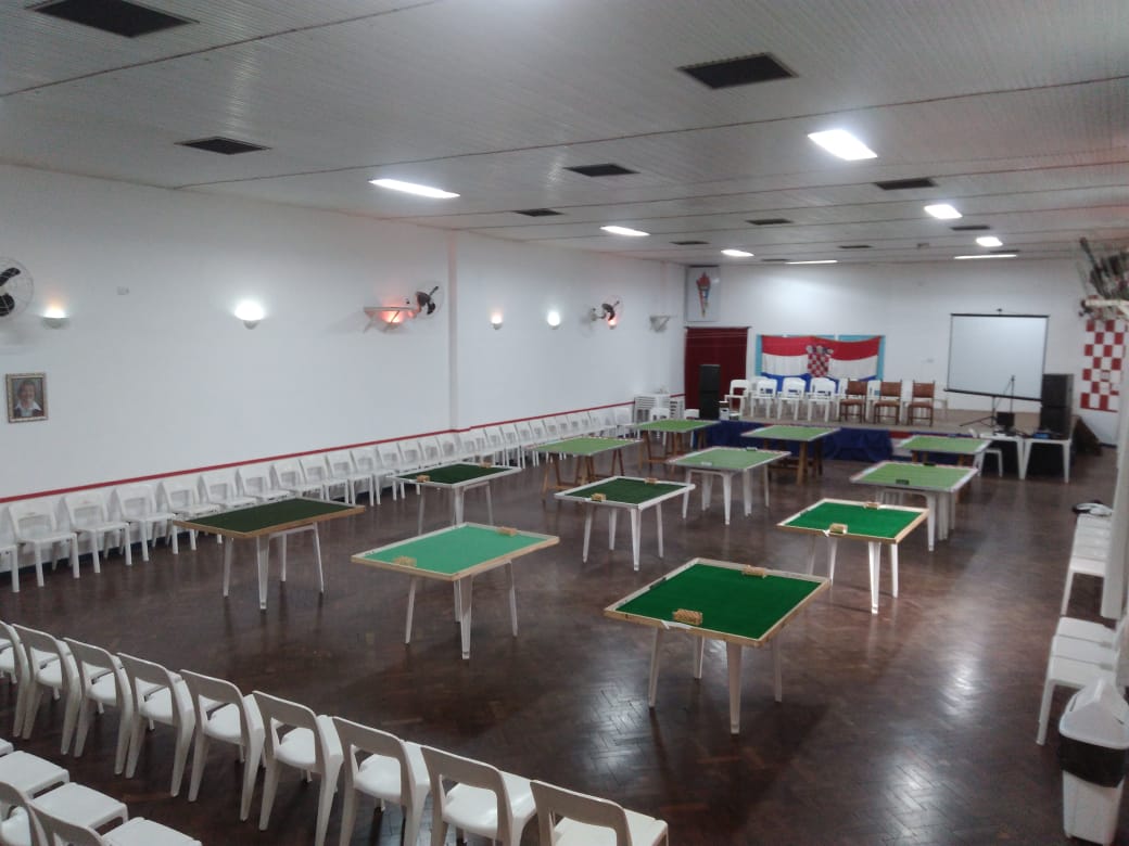 O salão social do Clube XV mede aproximadamente 35m de comprimento por 15m de largura.