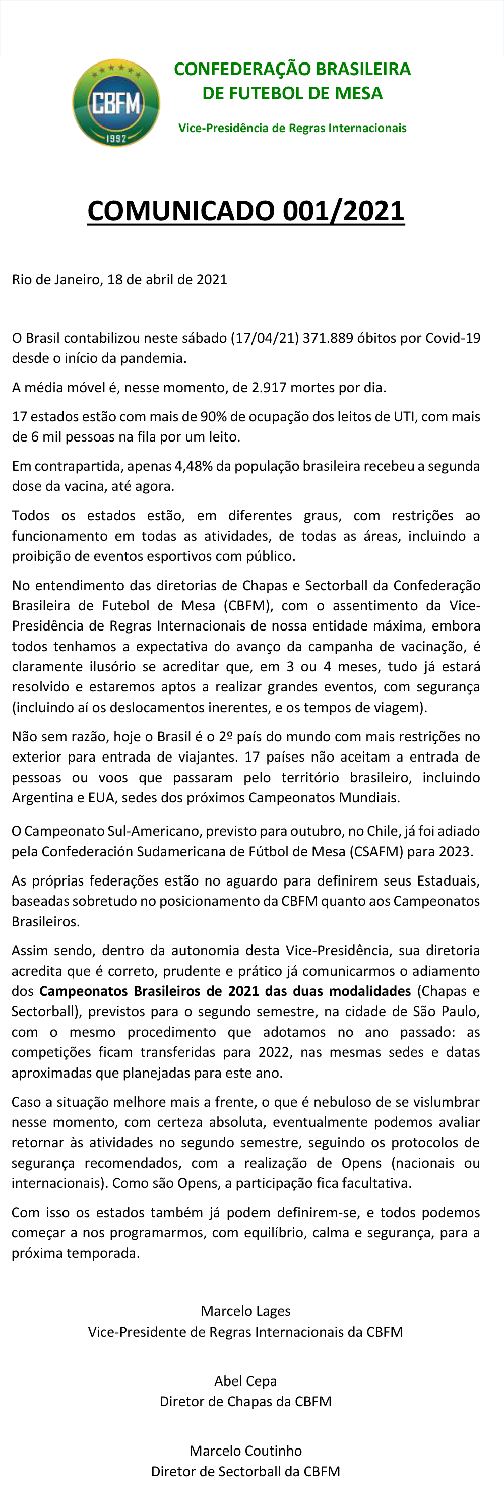Comunicado 001/2021 – CBFM