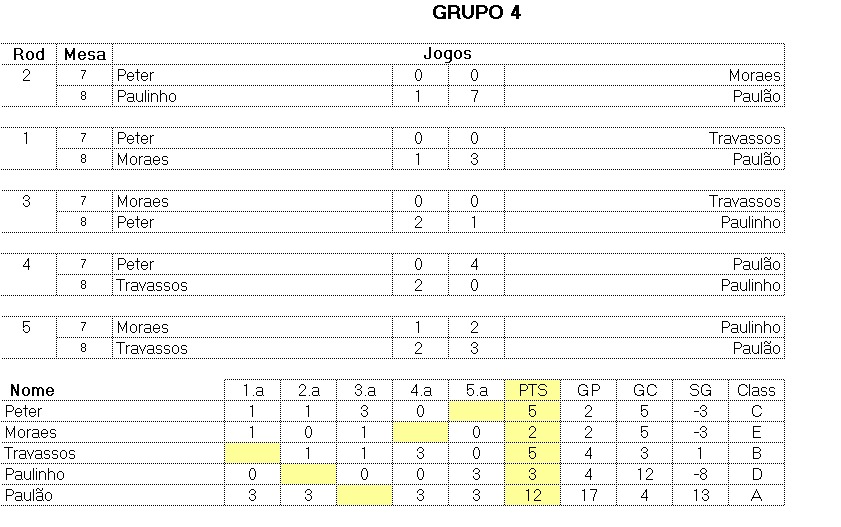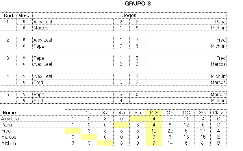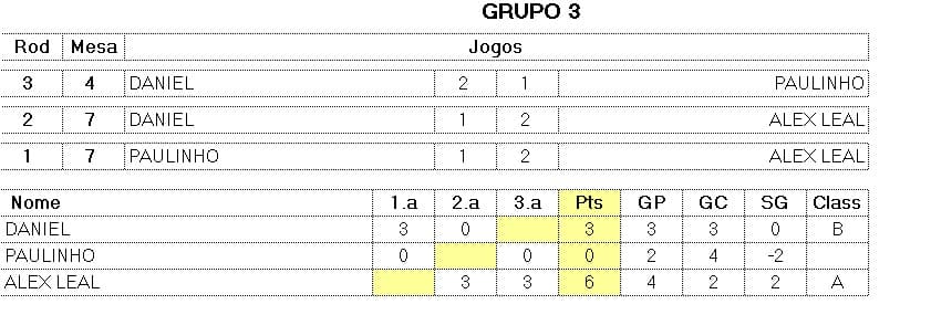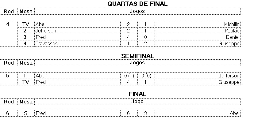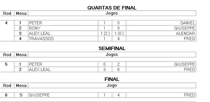 Em terceiro lugar, com uma campanha não menos brilhante, chegou Peter van den Houten, do Bangu. Na quarta posição outro banguense, mas do Bangu de Curitiba, Alex Leal. Demonstrando um jogo sólido e de talento, Alex só não seguiu adiante porque enfrentou o experiente Fred na semi-final e perdeu por 6 a 3, em um jogo bastante movimentado e cheio de gols.
