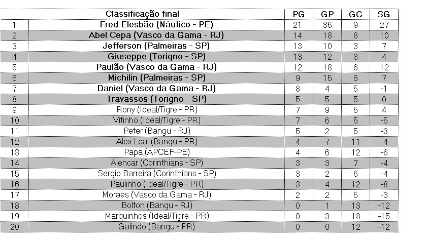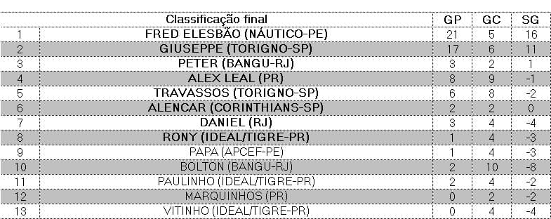 O jogador do cruzmaltino é o líder do ranking nacional da modalidade e foi derrotado por um placar digno de uma final, 6 a 3, tendo feito um dos gols mais belos do campeonato. Jefferson, do Palmeiras (SP) classificou-se na terceira posição, à frente de Giuseppe, do Torigno.