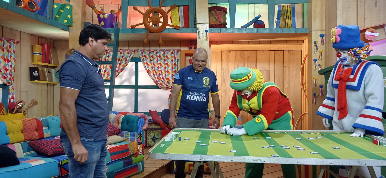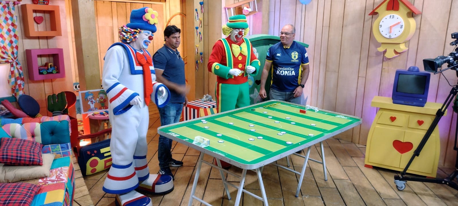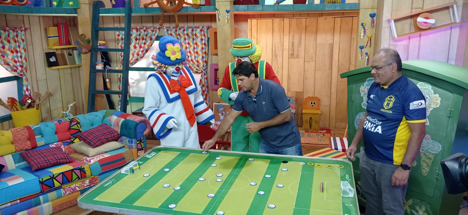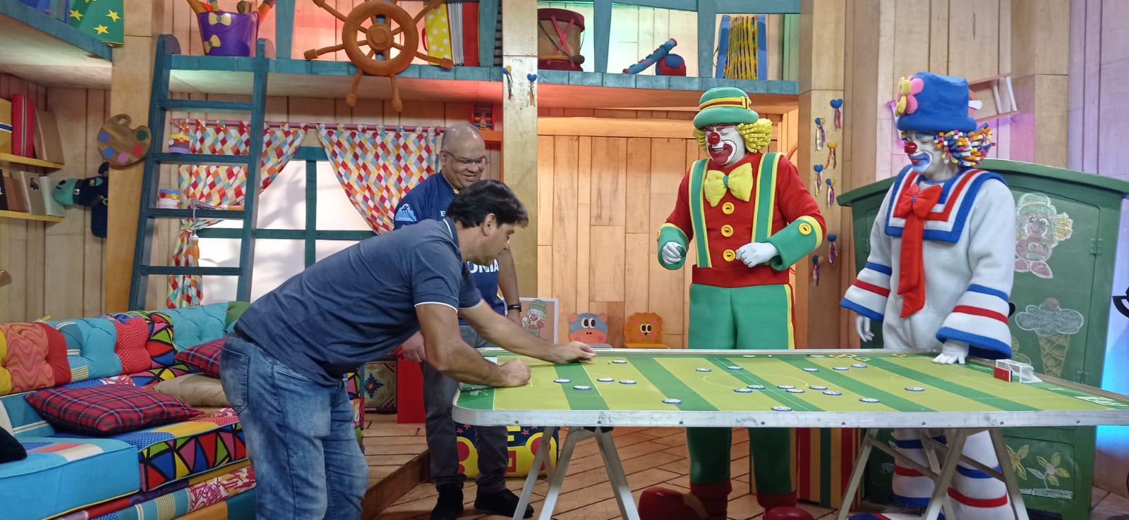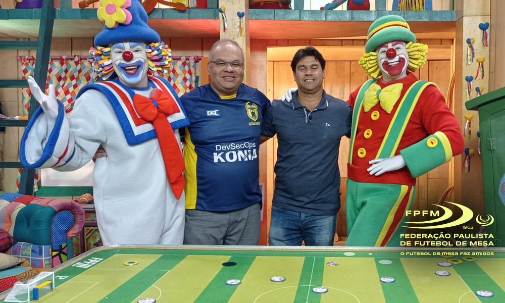 A Federação Paulista de Futebol de Mesa esteve hoje representada pelo seu diretor de eventos Isaias (Tele) e o amigo Fábio Lessa da Liga Água Branca, no programa infantil dos palhaços Patati e Patatá.