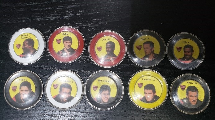 Muito famosos ficaram os “botões de osso ou de paletó”, que nada mais eram que os botões retirados dos antigos ternos e casacos sociais; dentre esses, uma classe de botões conhecida como “Paulo Caminha” que marcou época; depois vieram as “capas ou tampas de relógio”, que nada mais eram que os “vidros” ou “acrílicos” provenientes dos relógios que iam para conserto e tinham os mesmos substituídos; finalmente, na década de 1950, surgiram os botões industrializados, de plástico, com adesivos ao centro, contendo os escudos ou mesmo as faces dos jogadores dos times famosos do Brasil e muitos outros.
