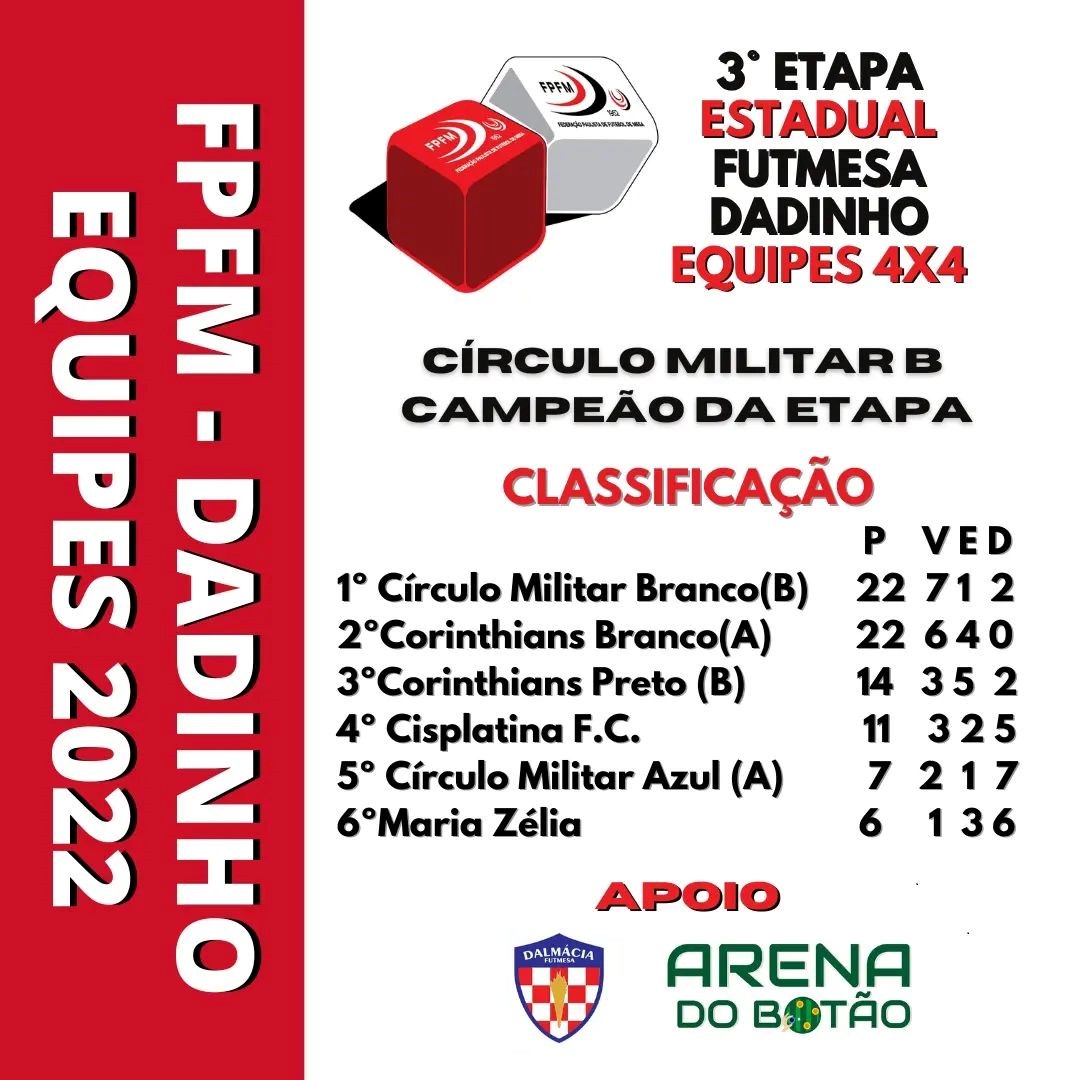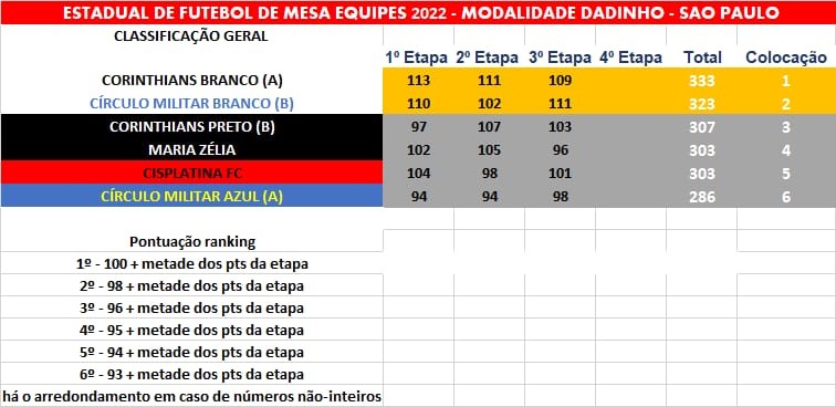 Na 3 colocação o Corinthians Preto( B) , seguido do Cisplatina , Círculo Militar Azul e fechando a tabela, o Maria Zélia.