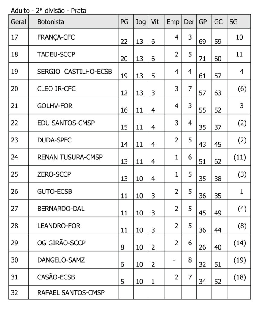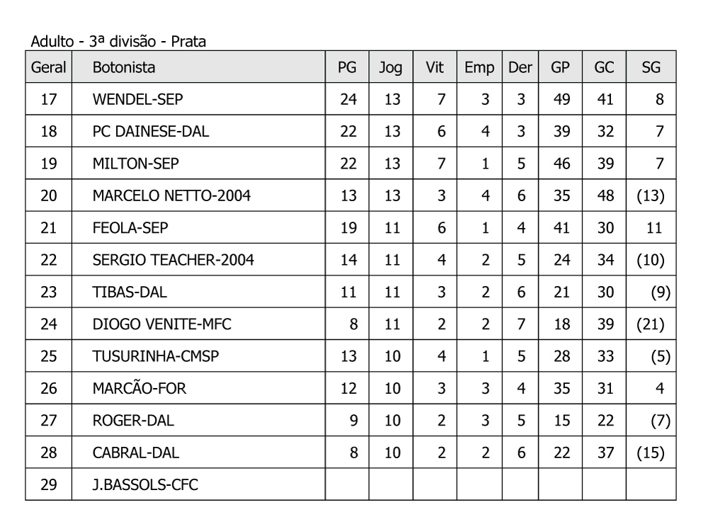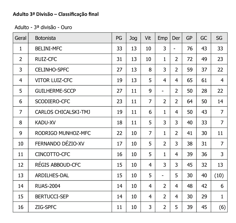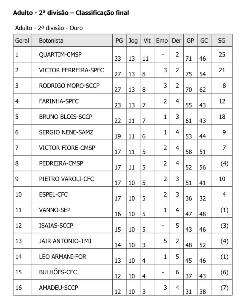 Quartim do Círculo Militar e Belini do Meninos Fc faturam respectivamente a segunda e terceira divisão do adulto no sábado do Super Pro de Santos, agradecimentos especiais ao Clube 2004 na pessoa do Mario Novaes e a prefeitura de Santos, mesmo com muito calor, tivemos um grande evento com os botonistas elogiando o local e as suas instalações, a FPFM procurou melhorar o material do evento e atender aos reclamos dos botonistas, obrigado a todos pelo apoio e compreensão. Veja como ficaram as classificações finais: